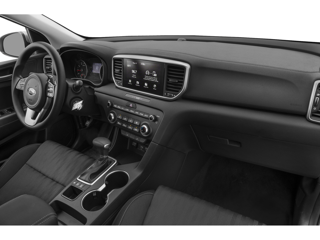 Romeo Kia proudly presents this 2020 Kia Sportage with 18 Alloy Wheels, 4-Wheel Disc Brakes, 6 Speakers, ABS brakes, Air Conditioning, Alloy wheels, AM/FM radio, Apple CarPlay & Android Auto, Auto High-beam Headlights, Automatic temperature control, Axle Ratio: TBD, Brake assist, Bumpers: body-color, Carpet Floor Mats, Delay-off headlights, Driver door bin, Driver vanity mirror, Dual front impact airbags, Dual front side impact airbags, Electronic Stability Control, Exterior Parking Camera Rear, Four wheel independent suspension, Front anti-roll bar, Front Bucket Seats, Front Center Armrest, Front dual zone A/C, Front fog lights, Front reading lights, Fully automatic headlights, Heated door mirrors, Heated Front Bucket Seats, Heated front seats, Illuminated entry, Leather Shift Knob, Leather steering wheel, Leatherette Seat Trim, Low tire pressure warning, Occupant sensing airbag, Outside temperature display, Overhead airbag, Overhead console, Panic alarm, Passenger door bin, Passenger vanity mirror, Power door mirrors, Power driver seat, Power Liftgate, Power steering, Power windows, Radio: AM/FM/MP3, Rear anti-roll bar, Rear seat center armrest, Rear window defroster, Rear window wiper, Remote keyless entry, Roof rack: rails only, Security system, Speed control, Speed-sensing steering, Split folding rear seat, Spoiler, Steering wheel mounted audio controls, Tachometer, Telescoping steering wheel, Tilt steering wheel, Traction control, Trip computer, Turn signal indicator mirrors, and Variably intermittent wipers.