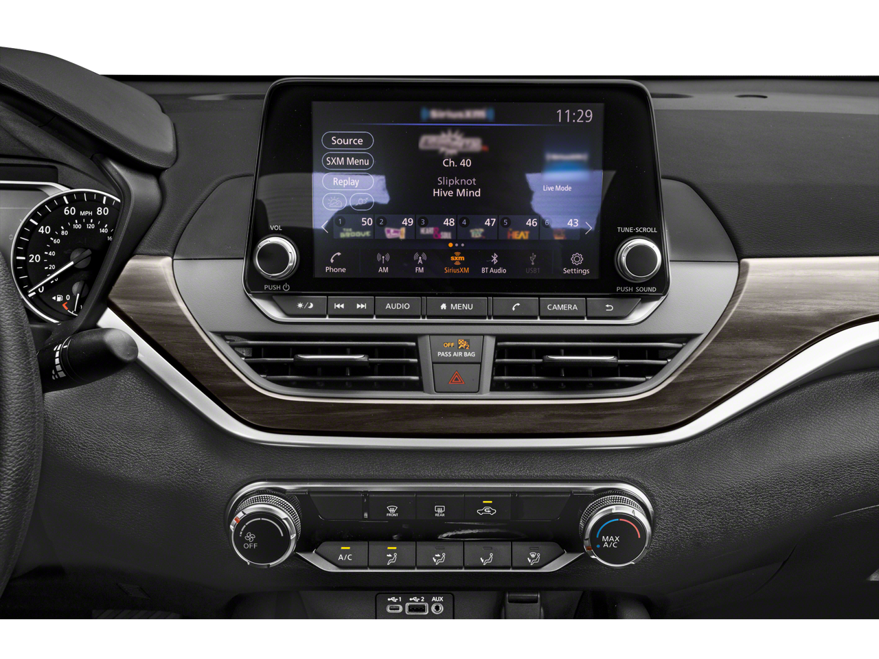 - Radio: Sistema de audio AM/FM -incluye: sistema de radio datos, reproductor de archivos MP3 y entrada auxiliar, 6 altavoces, NissanConnect con Apple CarPlay, Android Auto, pantalla táctil a color de 8 plg, 1 entrada USB delantera iluminada (de tipo C) para dispositivos compatibles, radio satélite SiriusXM con sistema avanzado de funciones de audio, sistema Bluetooth de teléfono a manos libres, difusión de audio mediante Bluetooth, asistencia de mensajes de texto a manos libres y reconocimiento de voz Siri Eyes-Free/Google Assistant