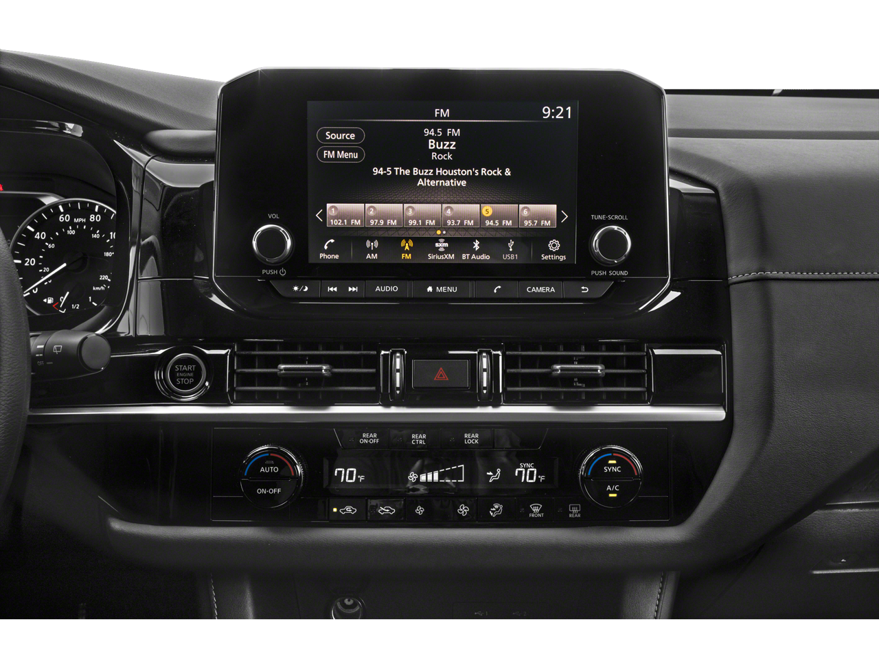 - Radio: Sistema de audio AM/FM -incluye: 6 altavoces, NissanConnect con compatibilidad para Apple CarPlay y Android Auto, pantalla a color de 9 plg con control multitáctil, radio satélite SiriusXM con sistema avanzado de funciones de audio, 2 entradas USB delanteras iluminadas (1 tipo A y 1 tipo C) para interfaz iPod y otros dispositivos compatibles, sistema Bluetooth de teléfono a manos libres, difusión de audio mediante Bluetooth, asistencia de mensajes de texto a manos libres y reconocimiento de voz Siri Eyes-Free/Google Assistant