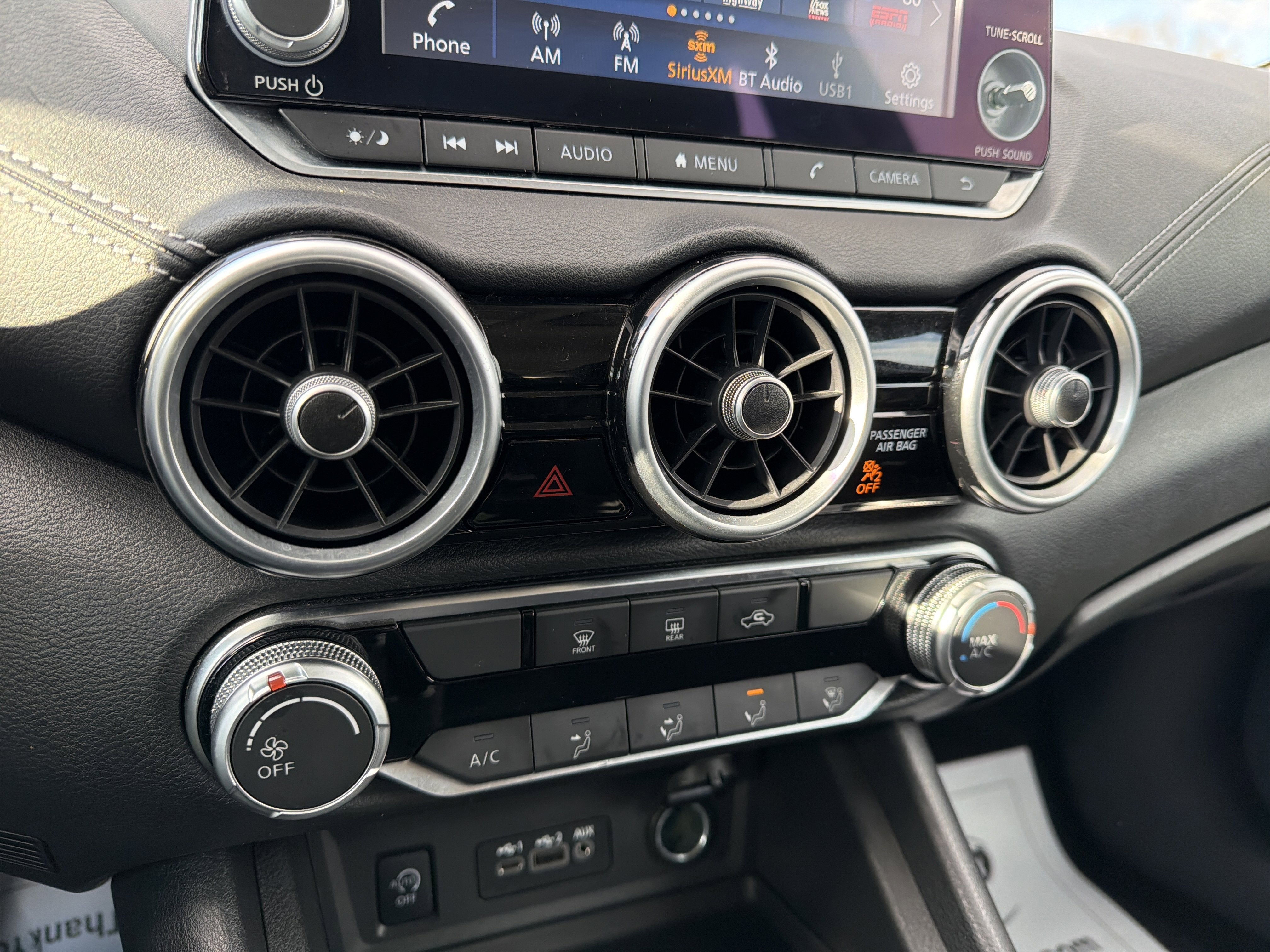 - Radio: AM/FM con sistema de radio datos/reproductor de MP3/entrada auxiliar -incluye: 6 altavoces más 2 altavoces de altos en el pilar A, pantalla a color de 8 plg con control multitáctil, difusión de audio mediante Bluetooth, sistema Bluetooth de teléfono a manos libres, asistencia de mensajes de texto a manos libres, Siri Eyes Free, reconocimiento de voz Google Assistant con Apple CarPlay y Android Auto, NissanConnect, 1 entrada USB delantera de tipo A, 1 entrada USB delantera adicional (tipo C), 1 entrada USB de carga solamente (tipo A) en la consola central, y radio satélite SiriusXM con funciones de audio avanzadas